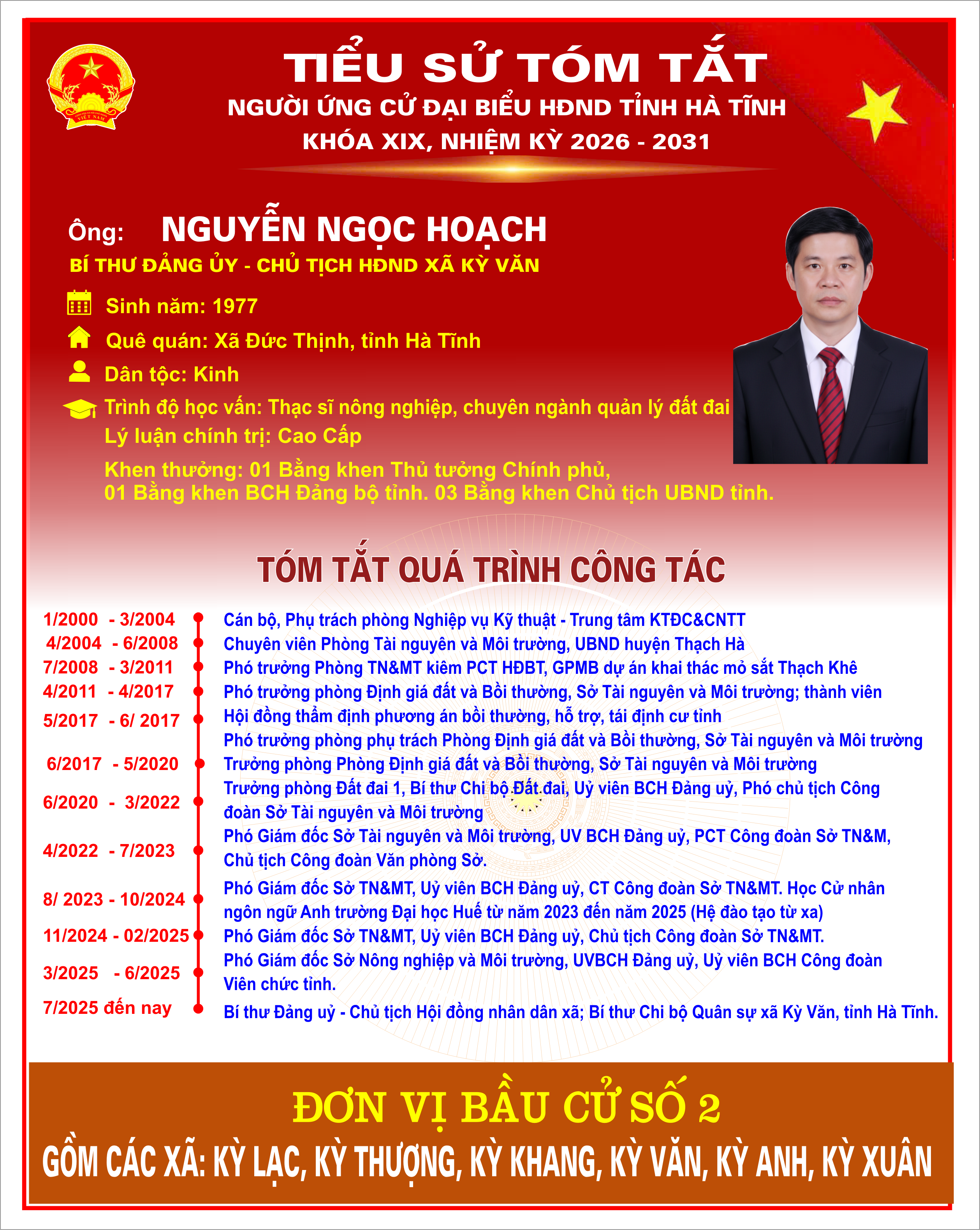 Như phần kê khai tại lý lịch, họ và tên khai sinh và thường gọi là Nguyễn Ngọc Hoạch, sinh năm 1977 tại huyện Đức Thọ cũ, nay là xã Đức Thịnh, tỉnh Hà Tĩnh. Trước khi nhận nhiệm vụ tại xã Kỳ Văn, tôi có 26 năm công tác trong ngành Tài nguyên và Môi trường, trưởng thành từ cán bộ chuyên môn cơ sở đến vị trí lãnh đạo, quản lý với chức vụ Phó Giám đốc Sở Tài nguyên và Môi trường, Sở Nông nghiệp và Môi trường (từ 01/3/2025 – 30/6/2025). Từ ngày 01/7/2025, thực hiện chủ trương sáp nhập đơn vị hành chính, tôi được Thường trực Tỉnh uỷ tin tưởng, điều động giữ chức Bí thư Đảng ủy, Chủ tịch HĐND xã Kỳ Văn. Trong suốt quá trình công tác, dù ở bất kỳ cương vị nào, tôi luôn đề cao tinh thần trách nhiệm, chấp hành nghiêm nguyên tắc tập trung dân chủ và nỗ lực hoàn thành tốt các nhiệm vụ được giao.