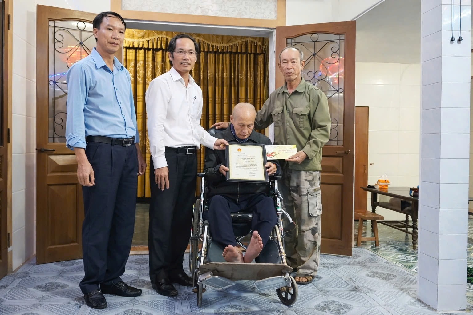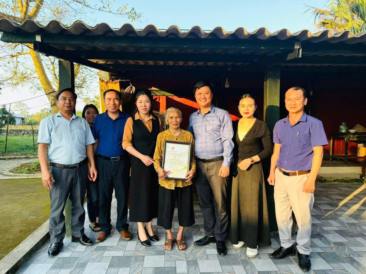 Đại diện lãnh đạo xã trao thiếp mừng thọ 100 tuổi của Chủ tịch nước CHXHCN Việt Nam cho cụ Nguyễn Trinh Phương, thôn Thanh Sơn, xã Kỳ Văn