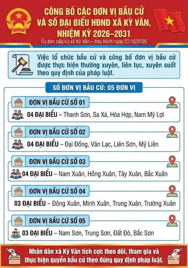 Thực hiện Nghị quyết số 06/NQ-UBBC, Ủy ban Bầu cử xã Kỳ Văn trân trọng thông báo danh sách các đơn vị bầu cử và số lượng đại biểu HĐND xã được bầu tại mỗi đơn vị, cụ thể như sau: