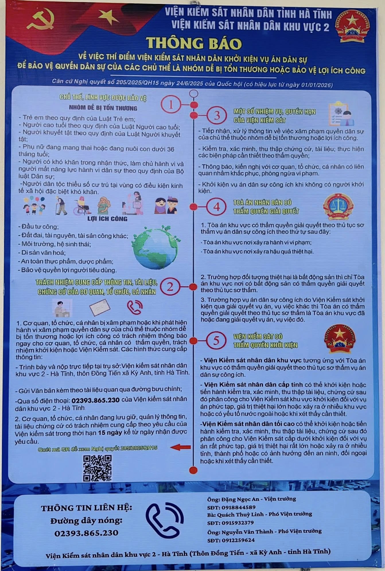 Thực hiện chủ trương của Viện kiểm sát nhân dân tối cao và Viện kiểm sát nhân dân tỉnh Hà Tĩnh về đẩy mạnh công tác tuyên truyền, phổ biến pháp luật đối với Nghị quyết số 205/2025/QH15 của Quốc hội về thí điểm Viện kiểm sát nhân dân khởi kiện vụ án dân sự để bảo vệ quyền dân sự của các chủ thể là nhóm dễ bị tổn thương hoặc bảo vệ lợi ích công, Viện kiểm sát nhân dân khu vực 2 - Hà Tĩnh đã tổ chức gắn bảng thông tin tuyên truyền Nghị quyết 205 tại trụ sở UBND xã Kỳ Văn, tỉnh Hà Tĩnh.
