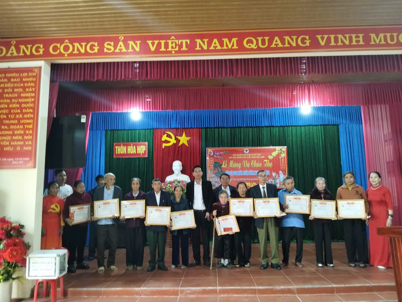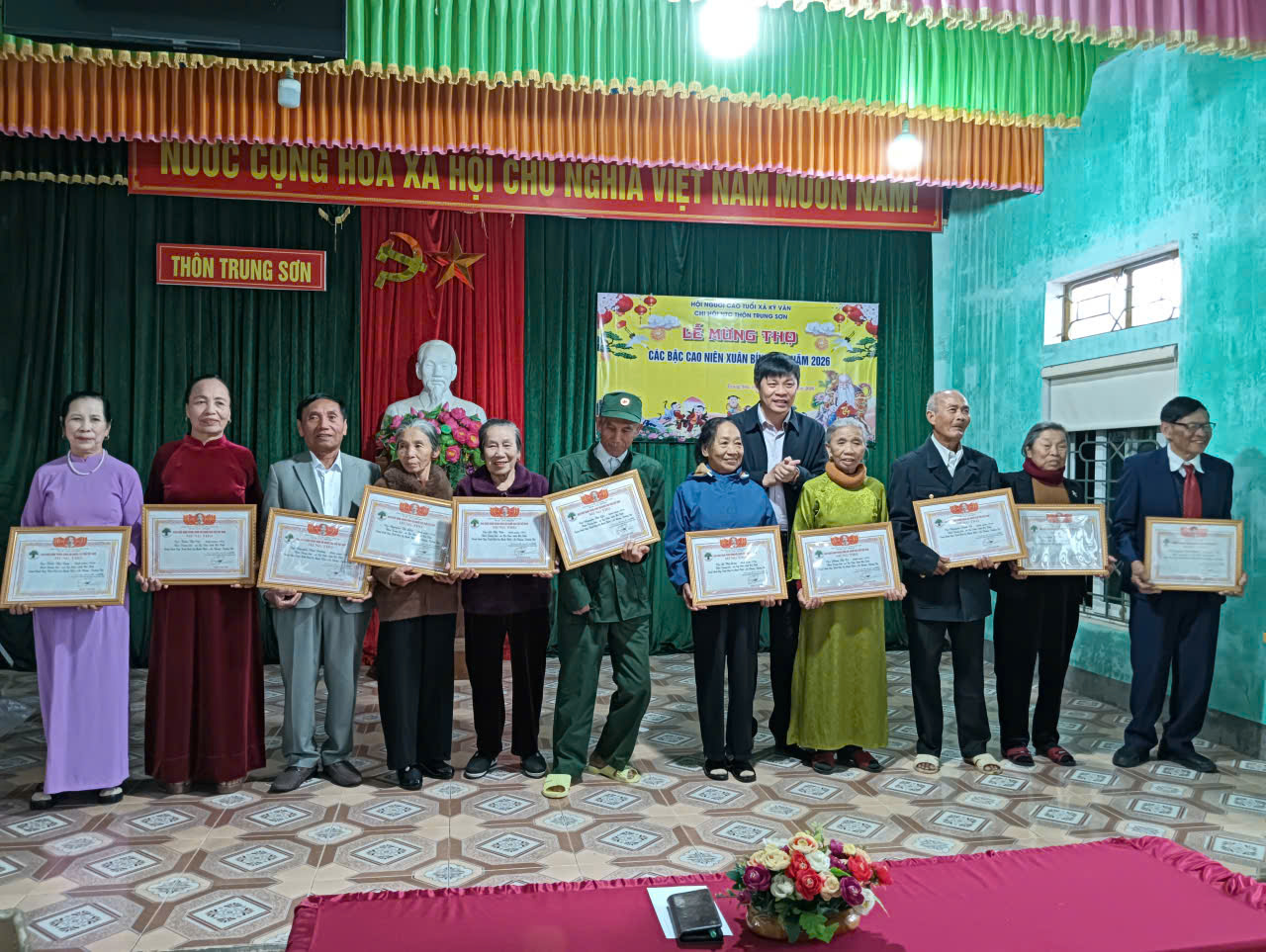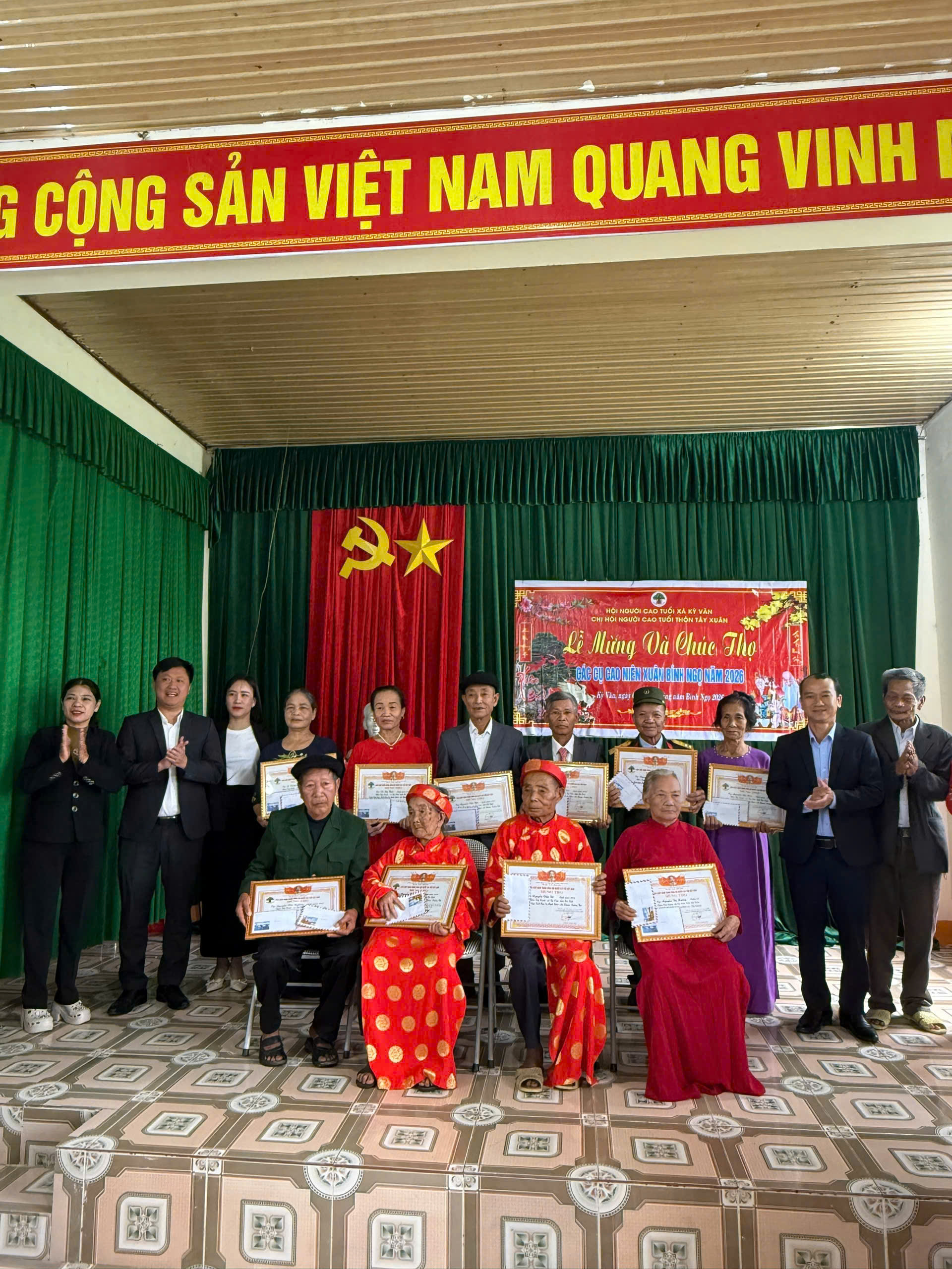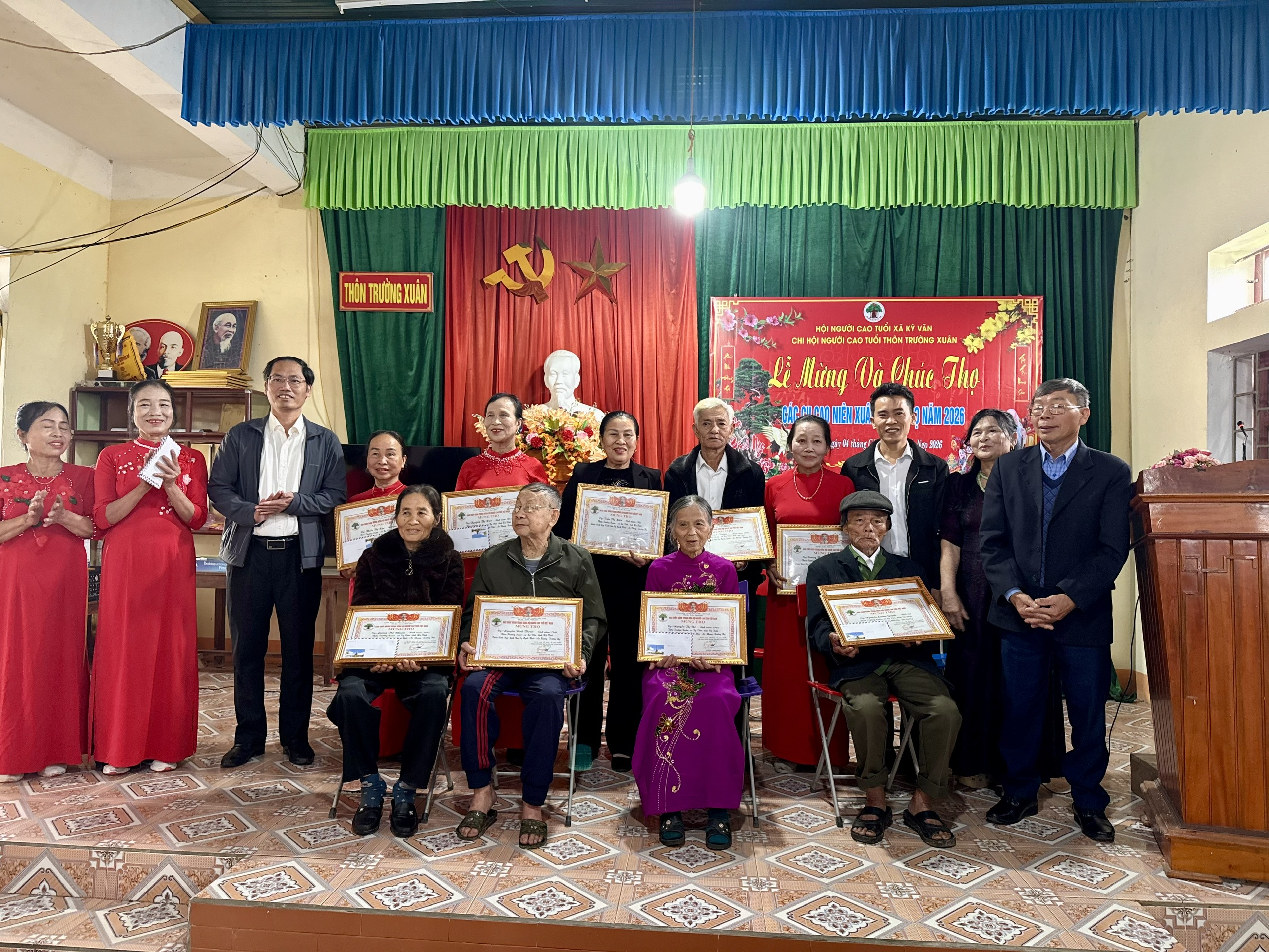 Đại diện lãnh đạo xã trực tiếp trao bằng chúc thọ, mừng thọ cho các cụ cao niên tại nhà văn hóa các thôn: