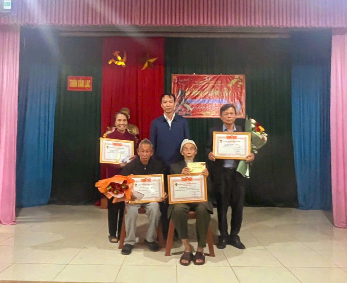 Đại diện lãnh đạo xã trao bằng chúc thọ, mừng thọ cho các cụ tại thôn Văn Lạc