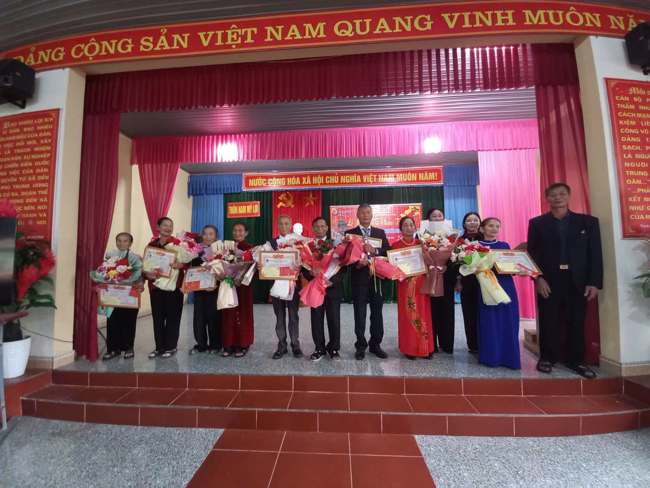 Đại diện lãnh đạo xã trao bằng chúc thọ, mừng thọ cho các cụ tại thôn Nam Mỹ Lợi