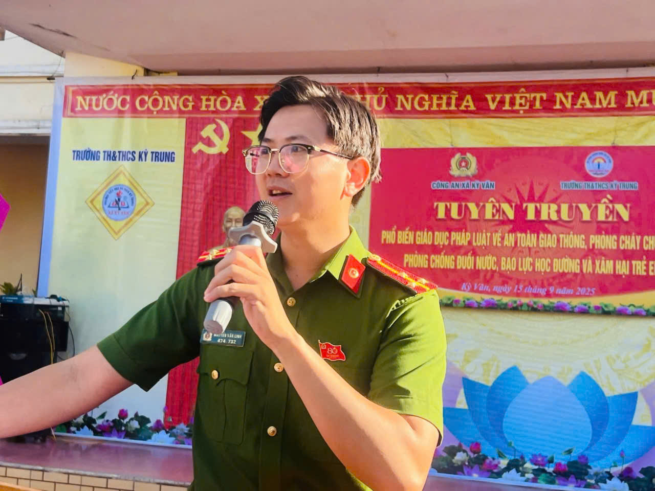 Ngày 15/09/2025 Công an xã Kỳ Văn phối hợp với Trường TH - THCS Kỳ Trung tổ chức tuyên truyền phổ biến pháp luật về an toàn giao thông, Phòng cháy chữa cháy, phòng chống đuối nước, bạo lực học đường cho hơn 300 em học sinh.