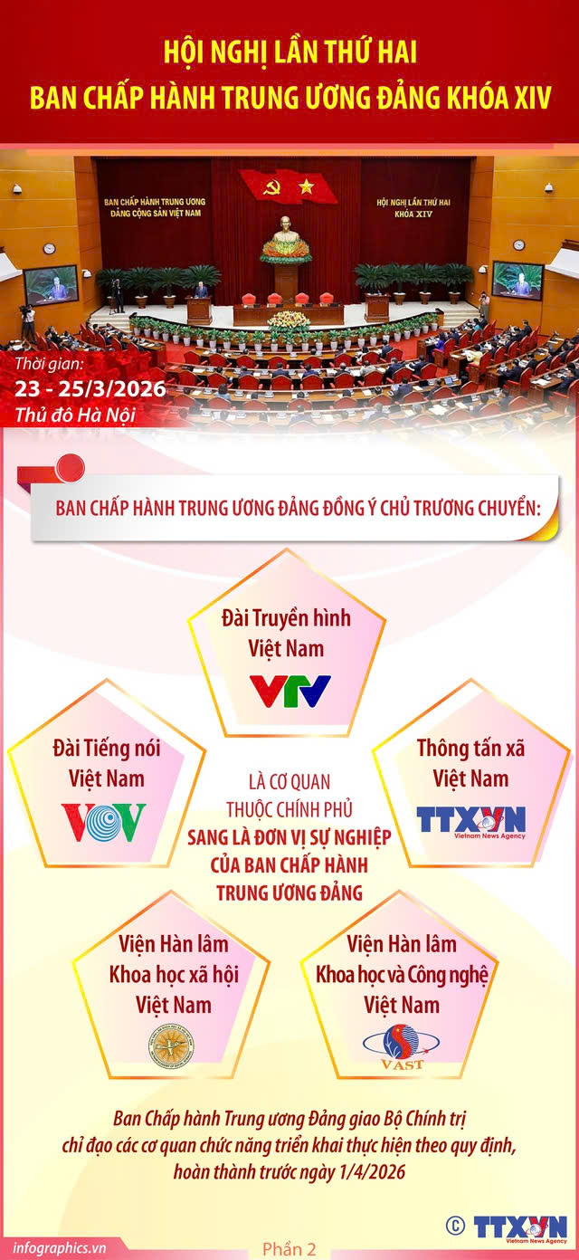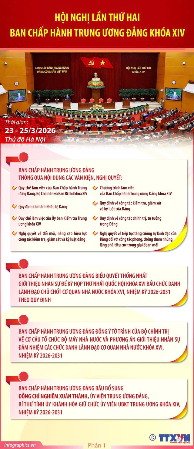 Thực hiện Chương trình làm việc toàn khoá, từ ngày 23/3 đến ngày 25/3/2026, tại Thủ đô Hà Nội, Ban Chấp hành Trung ương Đảng khoá XIV đã tổ chức Hội nghị lần thứ hai để thảo luận, cho ý kiến và quyết định một số nội dung quan trọng, có ý nghĩa nền tảng đối với nhiệm vụ triển khai thắng lợi Nghị quyết Đại hội XIV của Đảng, trực tiếp liên quan đến chất lượng lãnh đạo, cầm quyền và sức chiến đấu của Đảng; hiệu lực, hiệu quả hoạt động của cả hệ thống chính trị; sự phát triển nhanh, bền vững của đất nước trong giai đoạn 2026 - 2031 và những năm tiếp theo. Đồng chí Tổng Bí thư Tô Lâm chủ trì, phát biểu khai mạc và bế mạc Hội nghị.