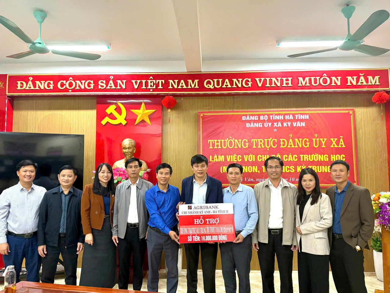 Cũng tại buổi làm việc, Ngân hàng Nông nghiệp và Phát triển nông thôn - Chi nhánh huyện Kỳ Anh đã trao tặng số tiền 10.000.000 đồng nhằm hỗ trợ cơ sở vật chất cho Trường TH & THCS Kỳ Trung, xã Kỳ Văn góp phần động viên Nhà trường và các em học sinh bước vào năm học mới nhiều thuận lợi hơn.