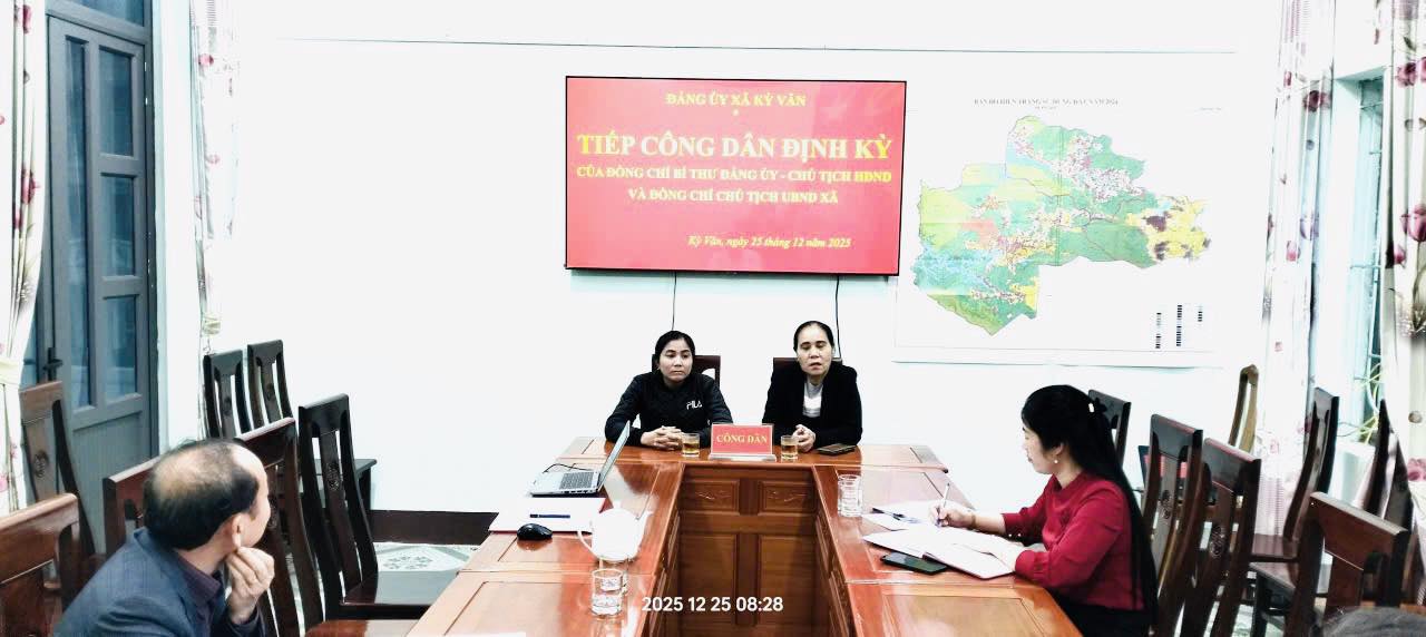 Thực hiện Luật Tiếp công dân năm 2013 và Chương trình công tác tháng 12 năm 2025, sáng ngày 25/12/2025, đồng chí Bí thư Đảng ủy xã Kỳ Văn và đồng chí Phó Chủ tịch UBND xã (được Chủ tịch UBND xã ủy quyền) đã tổ chức buổi tiếp công dân định kỳ tháng 12.