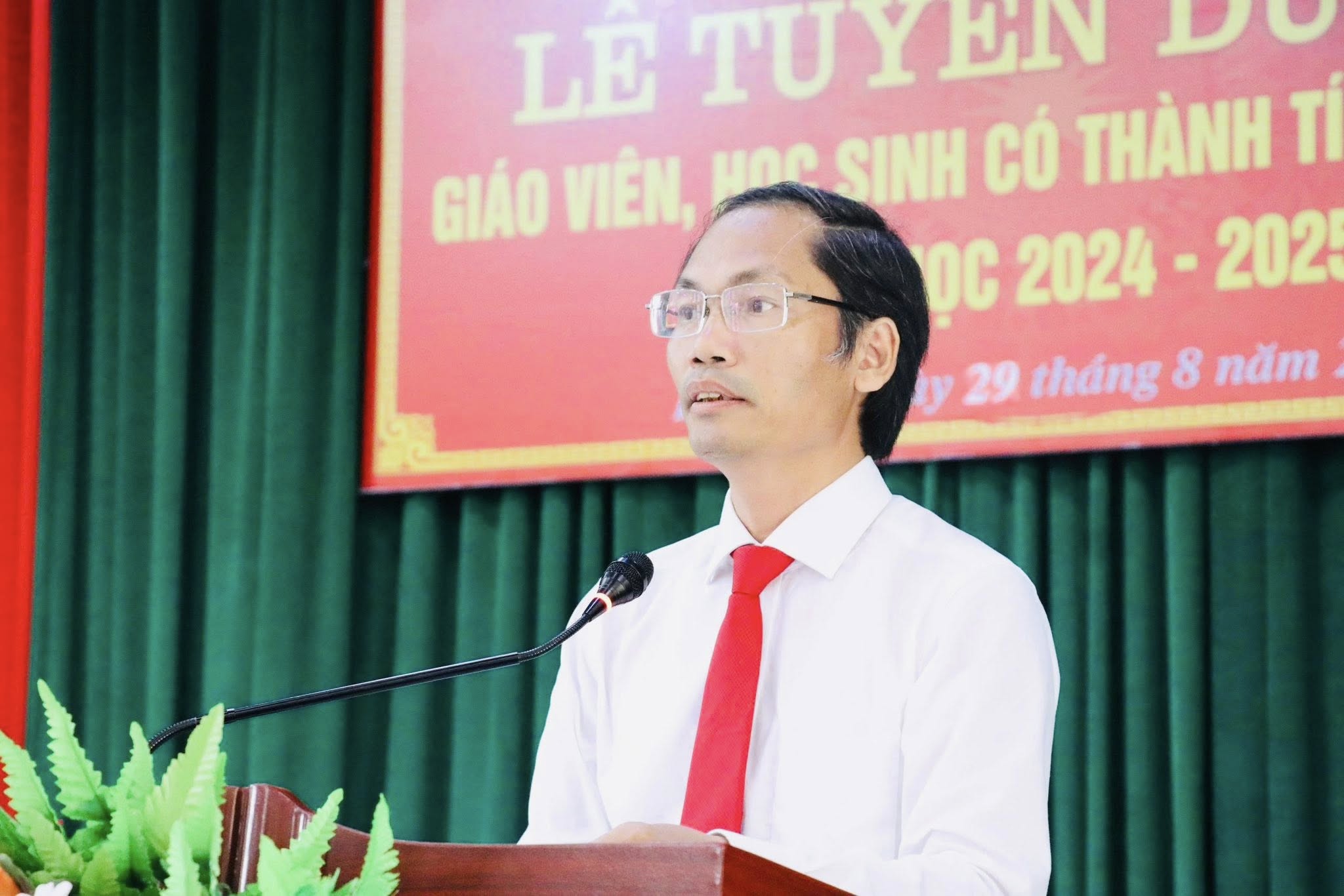 Phát biểu chúc mừng, đồng chí Nguyễn Đức Thắng – PBT Đảng ủy, Chủ tịch UBND xã đã biểu dương và ghi nhận những kết quả mà thầy cô và học sinh trên địa bàn xã Kỳ Văn đã gặt hái được những kết quả đã đạt được. Đồng chí cũng nhấn mạnh, học sinh giỏi luôn là mục tiêu, động lực phấn đấu và cũng là những thách thức lớn của các nhà trường và học sinh. Với tinh thần quyết tâm cao của toàn ngành trong việc triển khai thực hiện Nghị quyết số 71, ngày 22/8/2025 của Bộ Chính trị về đột phá phát triển giáo dục đào tạo. Lãnh đạo xã tin tưởng và đặt kỳ vọng vào ngành GDĐT, quý thầy cô và tất cả các em. Ngành giáo dục sẽ tiếp tục đẩy mạnh nâng cao chất lượng giáo dục toàn diện và chất lượng giáo dục mũi nhọn để có nhiều học sinh giỏi các cấp, có nhiều em hơn đậu vào các trường Đại học. Các thầy cô giáo cần tiếp tục không ngừng học hỏi, nâng cao trình độ chuyên môn, nghiệp vụ, đổi mới phương pháp dạy học. Các em học sinh hãy tiếp tục miệt mài học tập, tự tin và toả sáng để phát huy hơn nữa thành quả đã có, nhằm khẳng định vị thế của ngành giáo dục xã nhà cũng như làm rạng danh cho truyền thống hiếu học của quê hương Kỳ Văn.