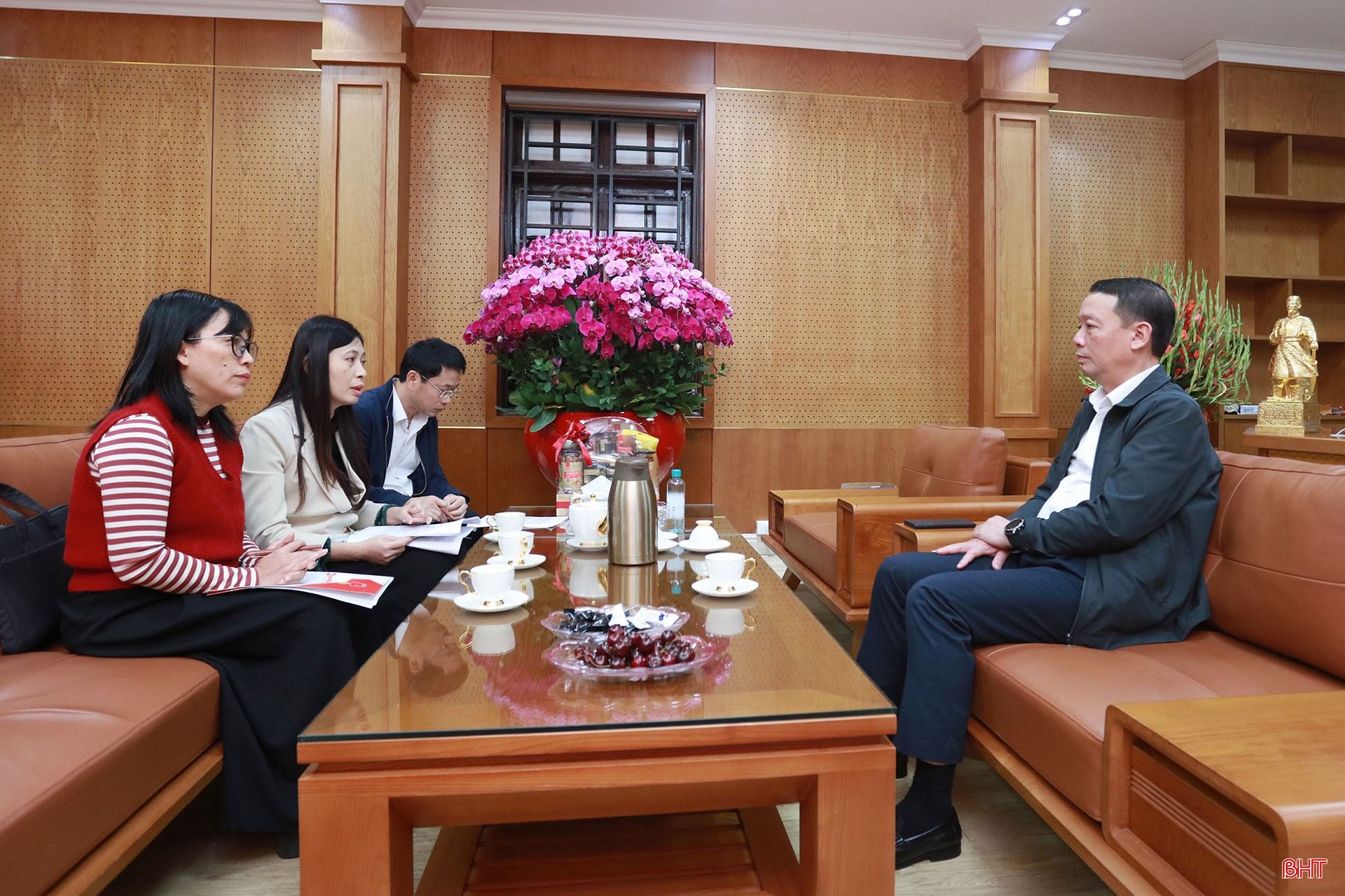 Đồng chí Chủ tịch UBND tỉnh Phan Thiên Định trao đổi với Ban Giám đốc cùng lãnh đạo Phòng Điện tử - NDS Báo và phát thanh, truyền hình Hà Tĩnh. Ảnh: Huy Tùng